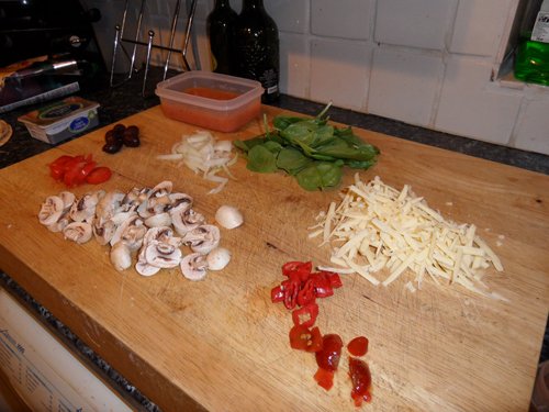 2. Get your toppings (in this case: tomato sauce, mushrooms, olives (for me), fresh tomatoes (for The Meat Eater), jalapenos, red chillis, onion, spinach, cheese