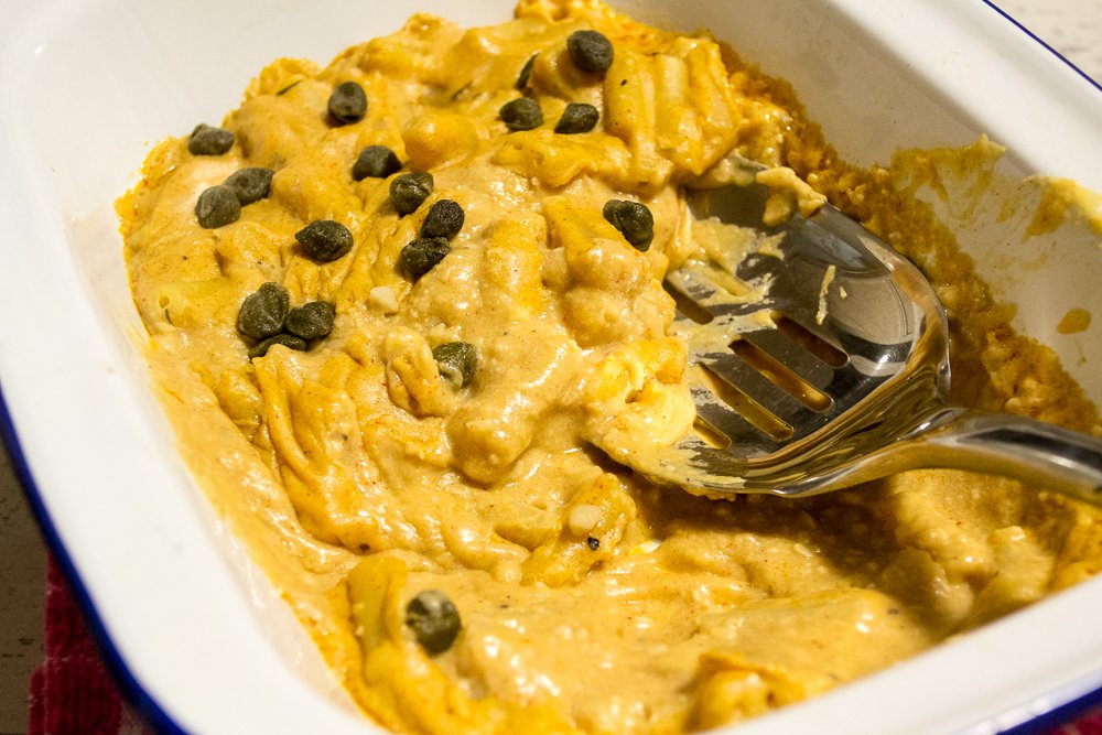 My Vegan Travels is laced with beautiful photos by Clare Winfield, and Jackie gives clear instructions for each recipe. Be warned though – this isn’t a ‘dinner on the table in 15 minutes’ type of cookbook – the recipes have long lists of ingredients but most of these are herbs, spices, flour, etc., i.e. stuff you’ll have in your cupboard anyway. For example, the Cauliflower Mac ‘n’ Jack I made has 19 ingredients but all I had to buy was the cauliflower (which I ended up throwing away – but more about that in a bit).